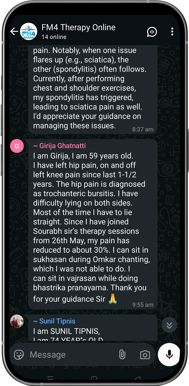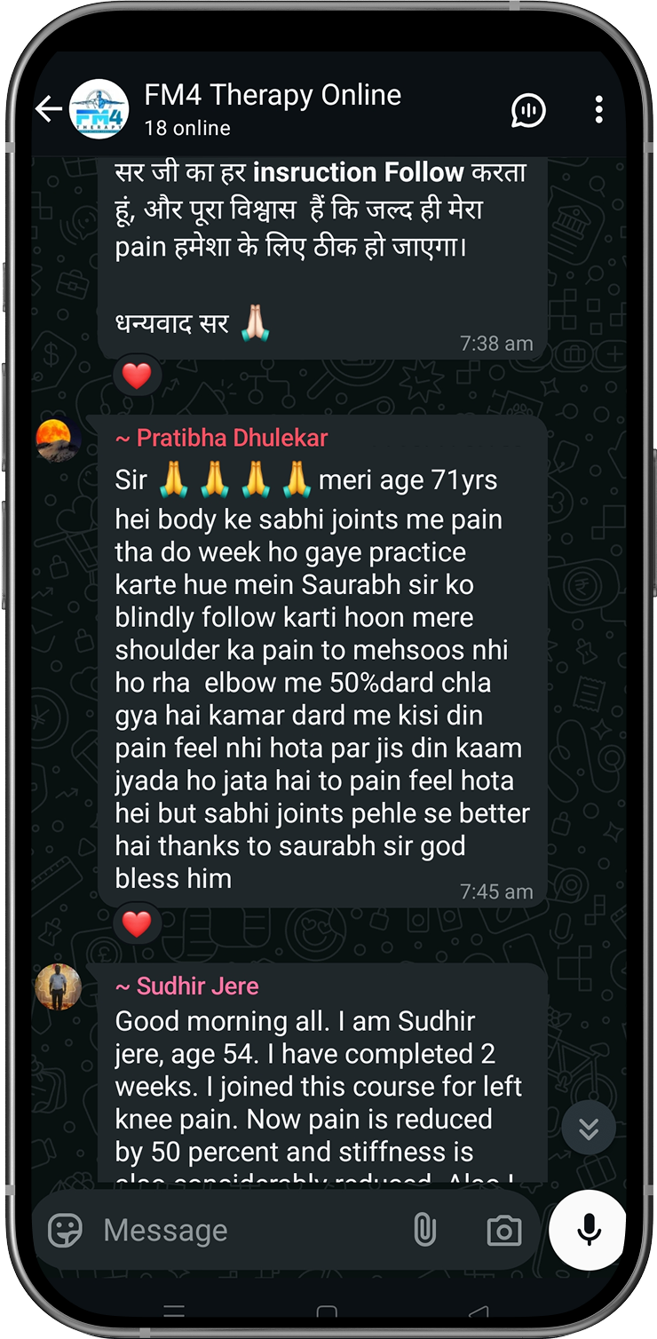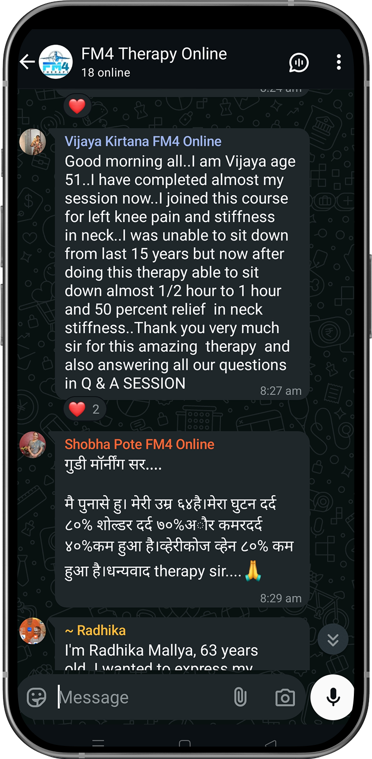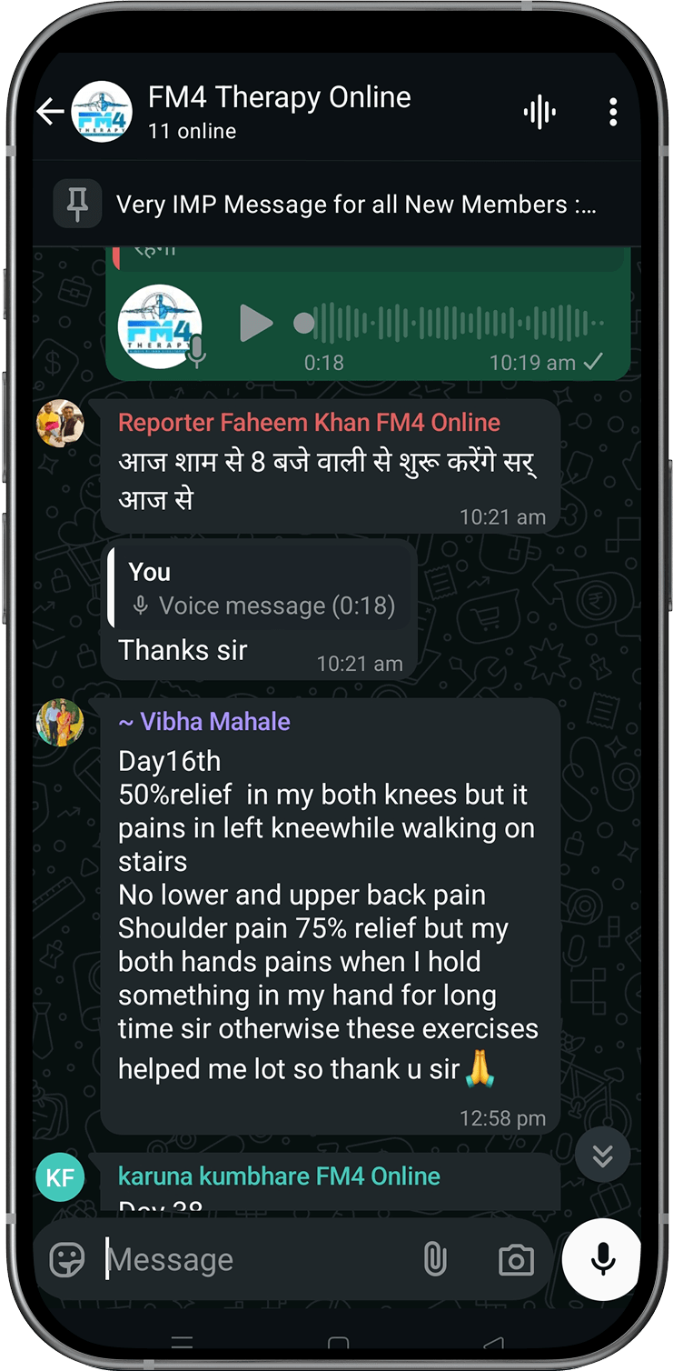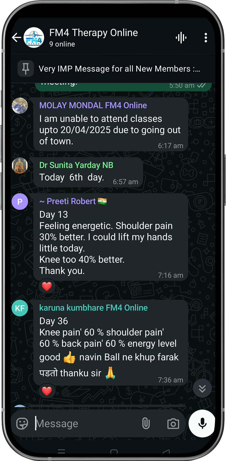 Disclaimer: FM4 Therapy is a lifestyle and movement-based pain management approach. It does not replace professional medical advice, diagnosis, or treatment. Individual results may vary. Always consult your physician before starting any physical program.
