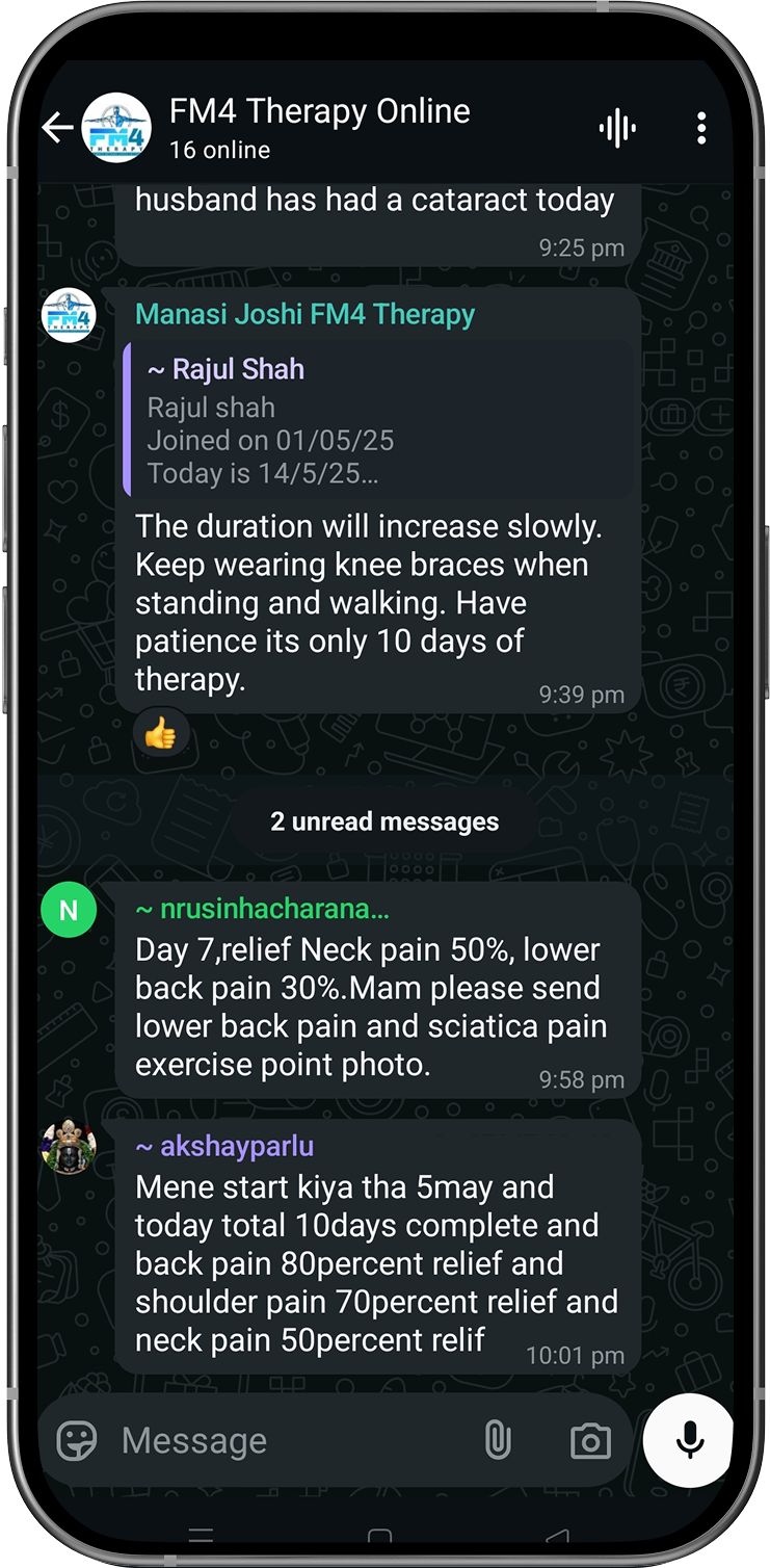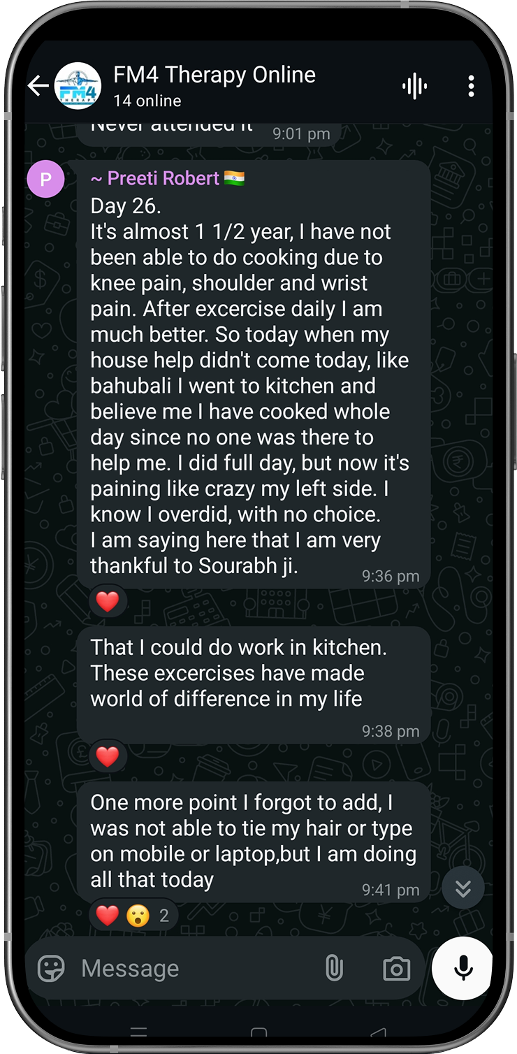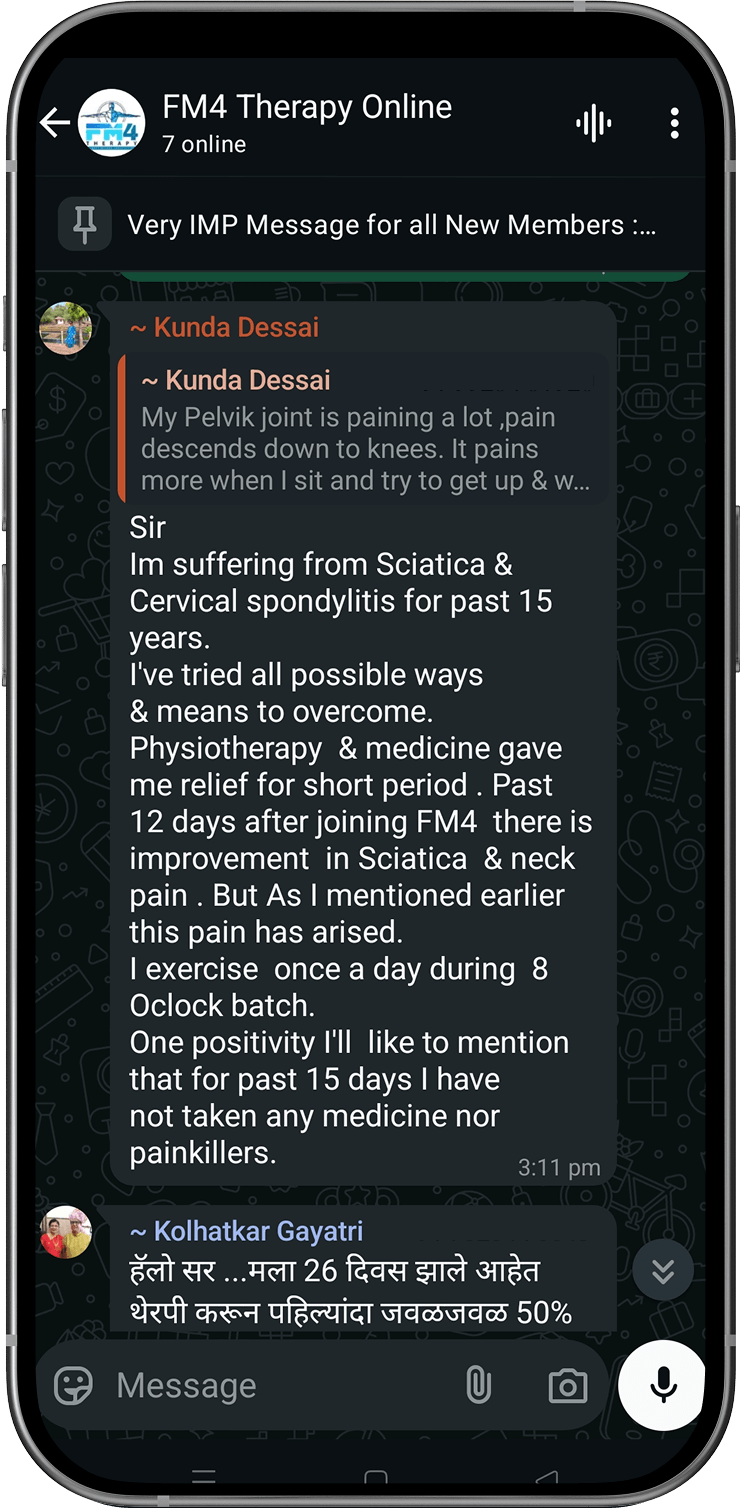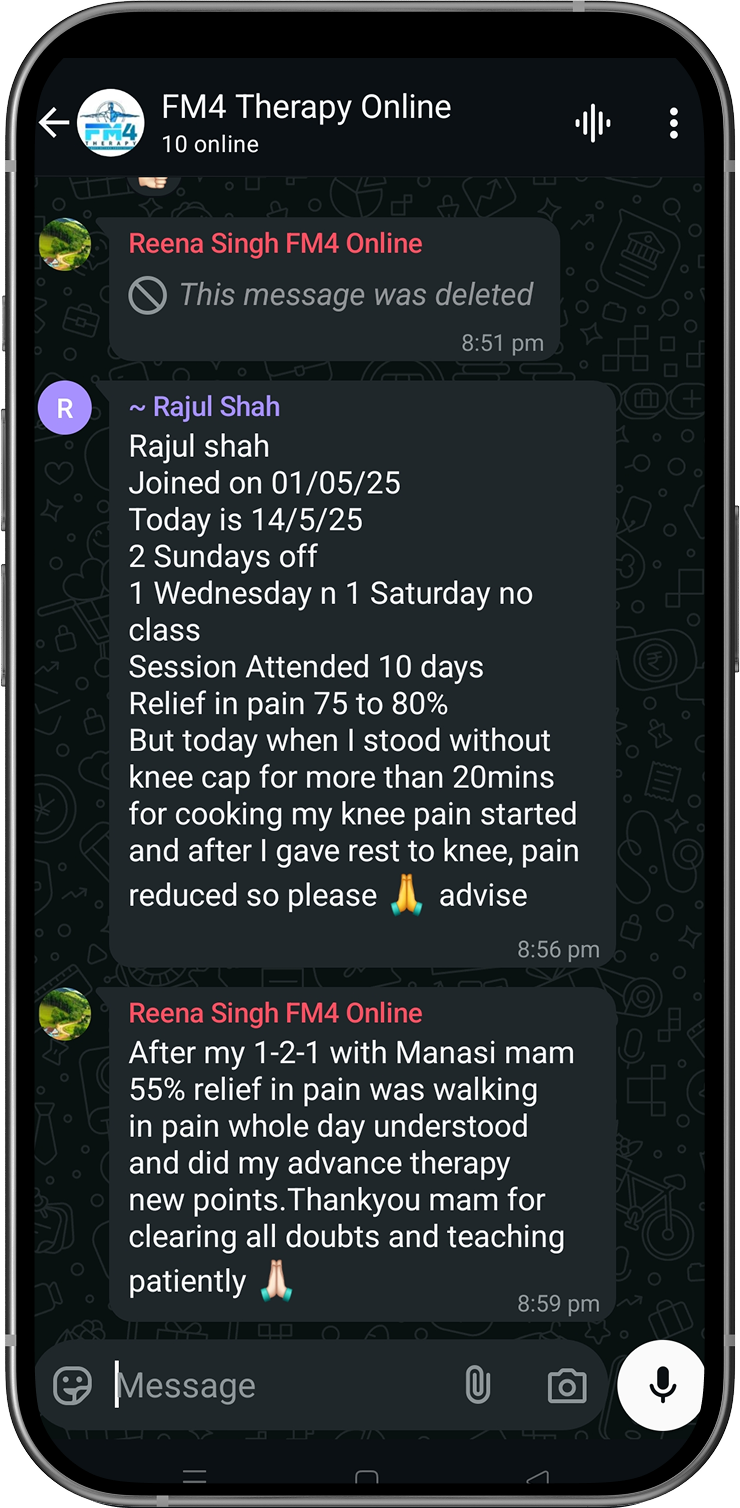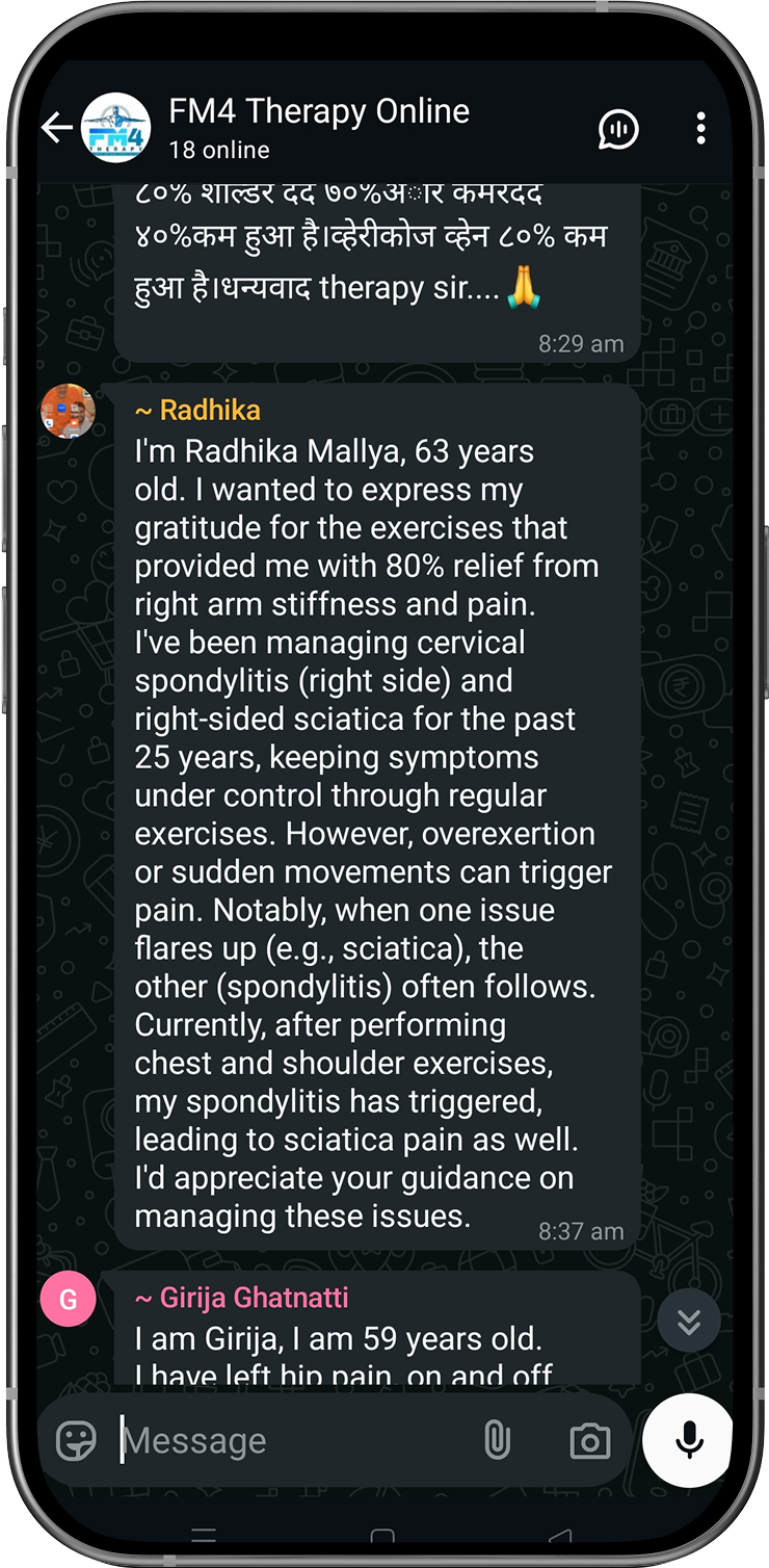 Disclaimer: FM4 Therapy is a lifestyle and movement-based pain management approach. It does not replace professional medical advice, diagnosis, or treatment. Individual results may vary. Always consult your physician before starting any physical program.